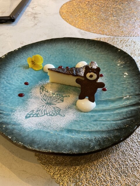 前橋千代田町にある頃から、良くお伺いしてましたが、テナントビルの電気設備不良のため、閉店したましたが、晴れてリオープンしているのをタウン誌で見かけ、早速お伺いしました。お気に入りの近藤スワインポークのグリル、グラスの赤ワインをオーダー。食後にバスクチーズケーキとコーヒーいただきました。皆、変わらず美味でした。チーズケーキに添えられたクマさんクッキーもシェフメイドとの事です。蝶々のステンシルもおしゃれです。ピッツァもおすすめらしいので、マルゲリータのリクエストでまた、お伺いしたいと思います。