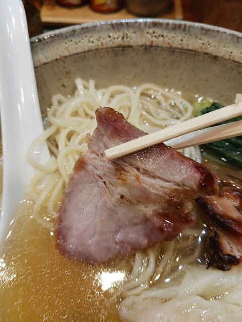 綺麗な透き通った黄金色のスープ。味はとても落ち着いて本当に円やかな味わい。塩って感じ(しょっぱい)なわけでもなく、魚介が強いわけでもない。油っぽくもない。鶏・動物系や節系、魚介色々なものが調和したスープなんだろうなと感じた印象。麺や他のトッピングを引き立てる味ですね。