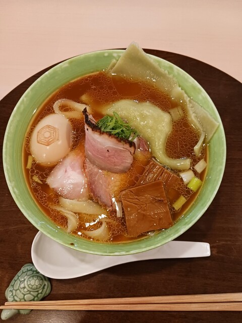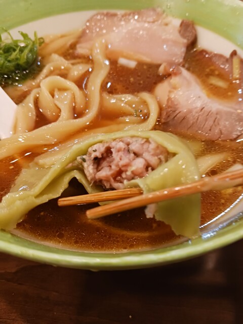 大きさは少し大きめサイズのワンタン。少し厚め緑色のワンタンです。丼ぶりの色に同化して堂々とのっています。味もスープに絡めて食べると旨い。中身のお肉も味が旨い。