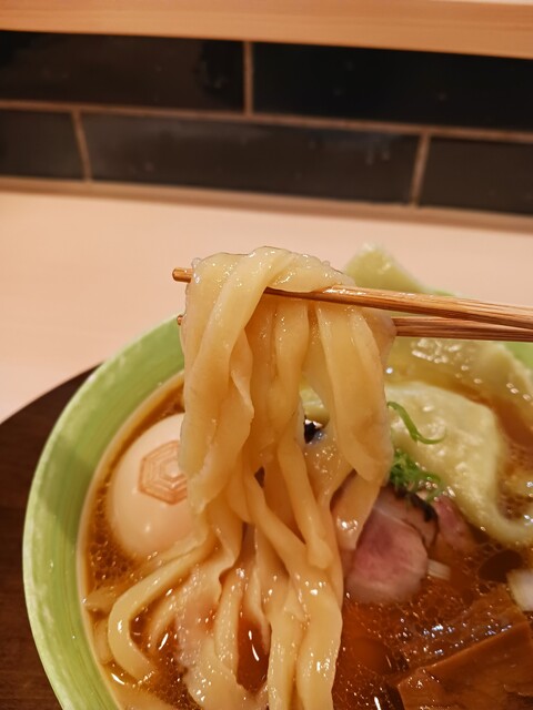 麵は手打ち麺!平たいちぢれ麺です。太さは太くもあり、細くもあり。食感は「もちもち感」もあるし「優しい歯ごたえ麺」もある感じです。「ぶにょん?ぱっつぱつ」?な感じの食感。表現しずらい…。麺とスープの抜群の相性は抜群で麺をすすると、「スープを麺が口の中まで一緒に持ち運んでくれる。」感じ。加えて、つるつる感がたまらないですね。「ズルズル、ブルブルツー」と麺がすすれる感じでした。想像していたより多加水で平たい麺で、食感が良く、食べやすいし素晴らしい!これはやばいですよ。
