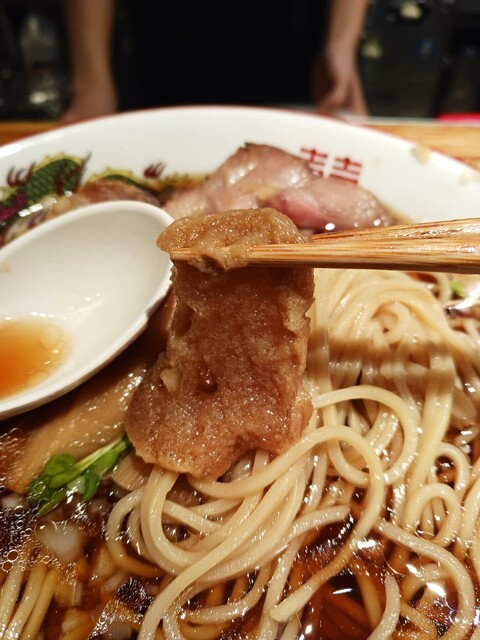 肩ロース肉の薄切りチャーシュー。近年流行りの低温加工で調理されているのか少し赤みがあります。柔らかいので食べやすいです。味は、見た目通りのイメージで柔らかく特徴的な味付けはないのでスープと麺と一緒に食べる感じ。肉は薄いし肉々しい感じはあまりないです。
