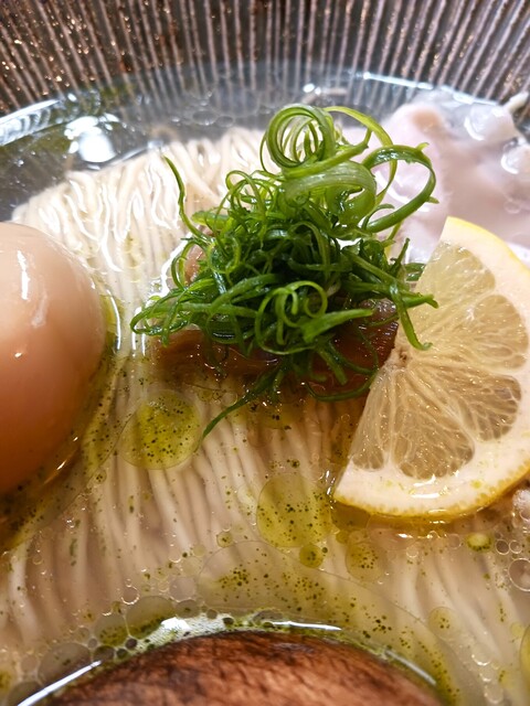 宇治抹茶の粉末がかかっていて全体的に表面は緑色っぽい。この抹茶の香りがとても合っていていい仕事している。加えて表面に浮いている香味油もまるでオリーブオイルのような香りがして、かつ油っぽくはない。魚介の味が感じられる良く出ている塩味のスープが美味しい。良く出来たスープに何となく麺がスープに負けている感じがする。