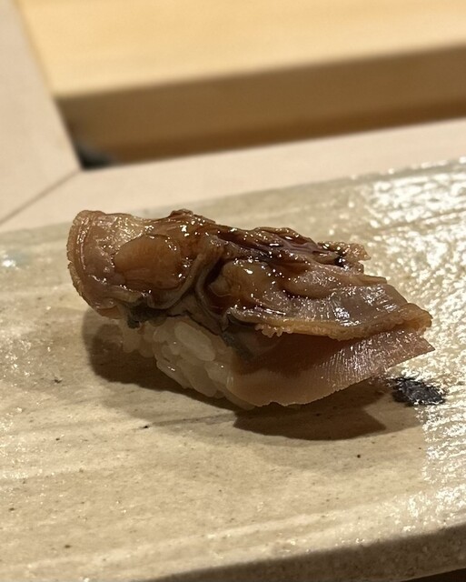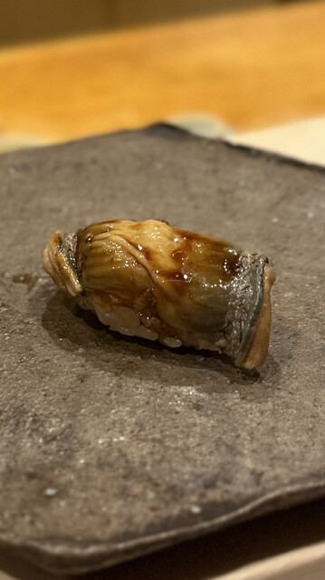 定番の光物とである小肌はしっかり締めつつ小肌の脂、味、旨味を感じさせてます。また酸味のしっかり効いた赤酢のシャリで、小肌の美味さを格段に跳ね上げてくれてます。