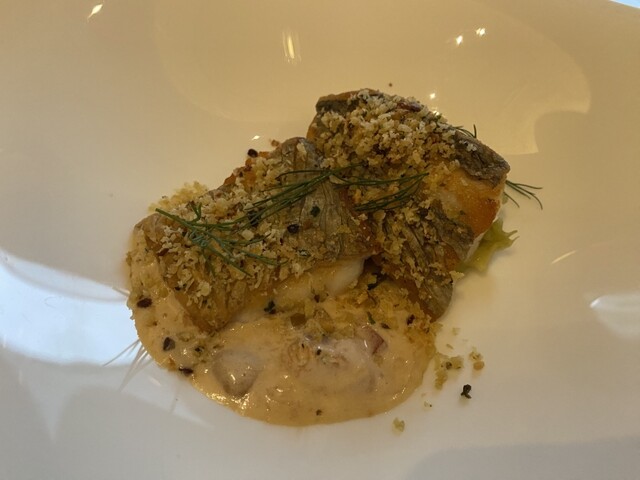太刀魚のソテー 香ばしく炒ったパン粉とディルのアクセント コラトゥーラでマリネした翡翠茄子のタルタル仕立て プラムと発酵のクレマを添えて