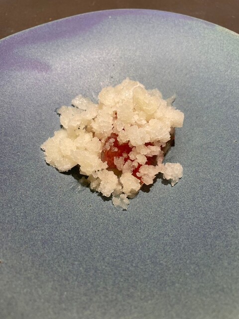 アミューズ;カリフラワーのムースリーヌ 甲殻類のジュレ、帆立貝とヘーゼルナッツ