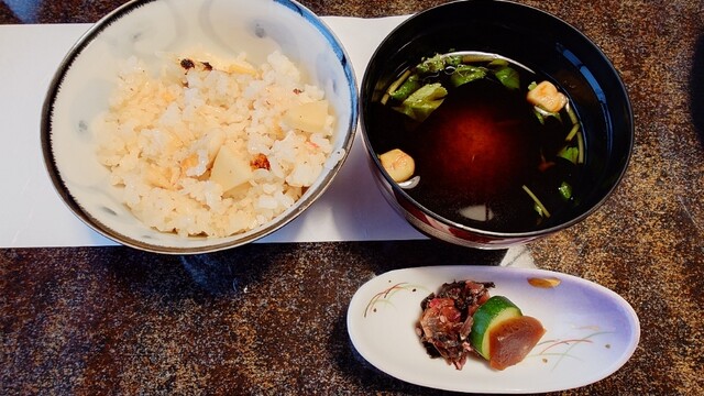 釜炊きのごはんが運ばれ、少々蒸してからいただきますが…、やっぱりおこげっていいよなぁ