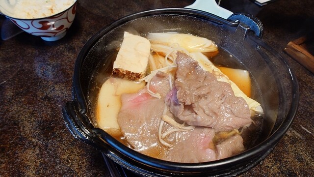 メインのすき焼きが運ばれてきました。和牛なので煮えすぎ注意ですぞ!相方!ほら~~