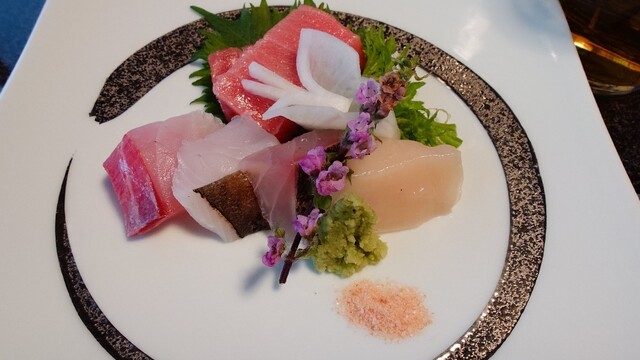 熟成魚の刺身は、まぐろ、えぼだい、すずき、ほたてのお造りで