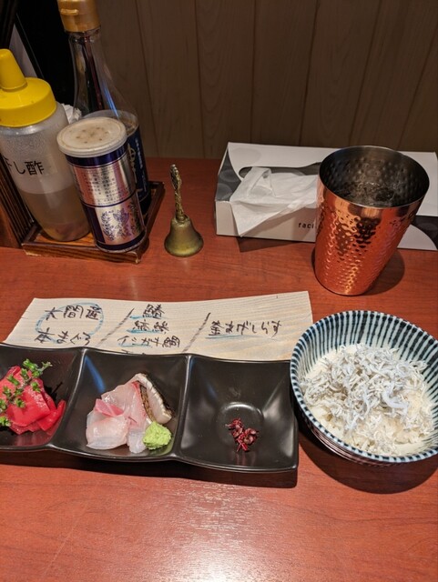 まずは刺身盛りと釜揚げシラス丼が運ばれて来ました。マグロ赤身・花咲ガニ・鰆炙り・真鯛…リッチな刺身盛り。シラスとご飯だけでも十分に美味しいですが、そこにセルフトッピングして頂きます〜ご飯も熱々で500円でこのクオリティ〜いやぁ…試して欲しいサービス品だと思います。