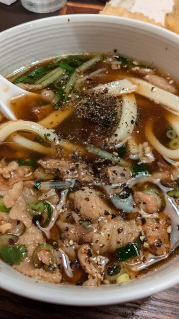 真っ白で重量感感じるうどん…美しいです。つけ汁は珍しい牛肉の醤油汁。お嬢さんが『黒胡椒好みでどうぞ』って…うどんに胡椒?思わず聞き返しました。