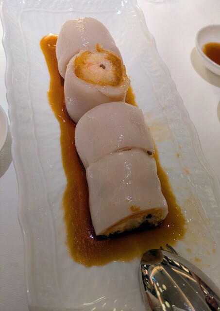 蜂蜜をソースにした豚バラチャーシューも目を見張るお味。海老春巻きも変わり海老フライを春巻きでくるんだお料理でサックリモッチリ…海老プリプリに香りがフワァ…抜群に美味しい。