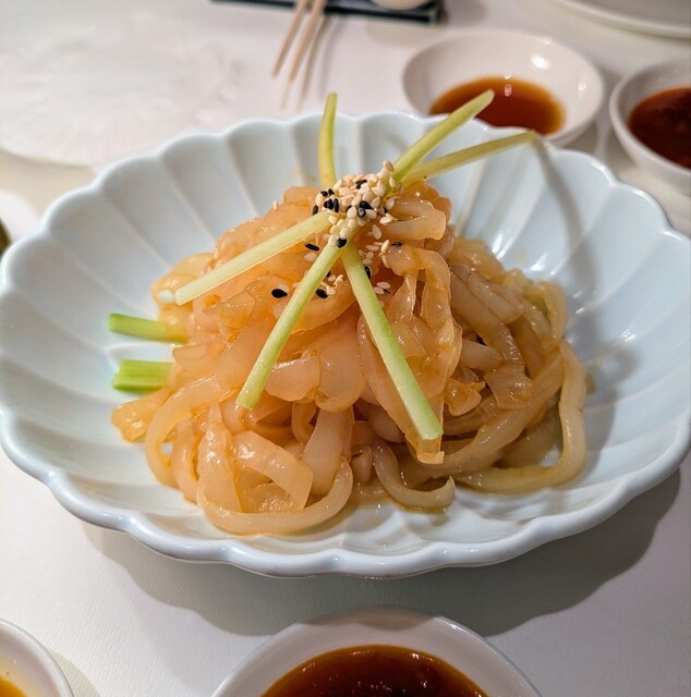 クラゲは太くて程よい味付けで素晴らしい歯触り。