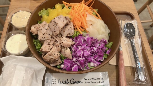 変更が多様性あること、Lサイズでドレッシングが2つ選べること、このプレートにおいてはカレーを食べた気にもなる事が魅力です。
