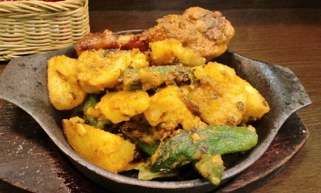 タンドリーチキン、サブジ(野菜の蒸し煮)が、熱々の鉄板の上でジュージュー音を立てています。