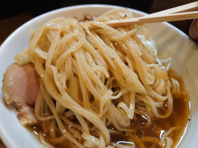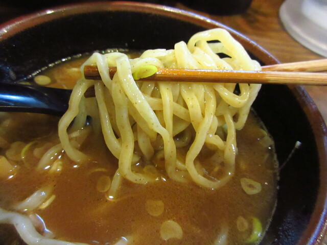 麺は全粒粉入りの中太の平打ち麺で風味もよく、コシの強い噛み心地もよくスープとの相性も抜群で美味しい麺です。