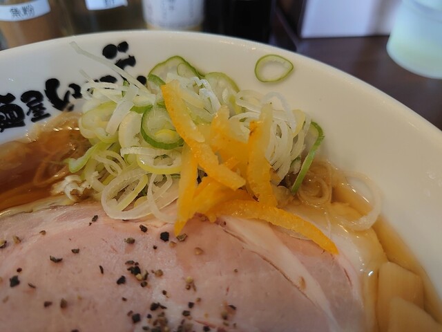 少し待って着丼です。淡い醤油色の清湯スープに大振りのチャーシューが1枚にメンマ、刻みネギ、柚皮のトッピングです。