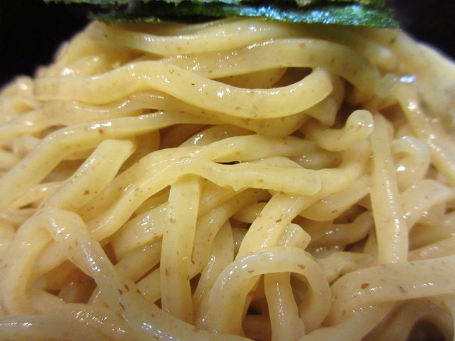 風味のエエ美味しい麺は全粒粉入りの平打ちの太縮れ麵で、濃厚な魚介豚骨出汁の旨味のつけ汁との絡み具合も良く美味しい麵です。