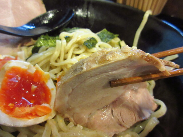 ではでは麺をいただきますね。小麦の香りも豊かなプリプリした食感で美味しいですねぇ。つけ汁は煮干、節の味がガツンときます。豚骨感は薄いです。つけ汁の中にもメンマやチャーシューがゴロゴロ入ってます。チャーシュー、味玉は薄味ですが、つけ汁と一緒に食べると凄く美味しいですよ。