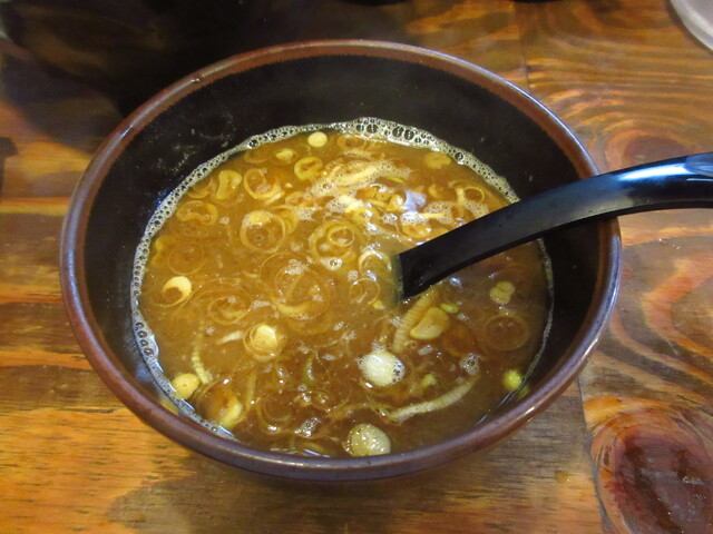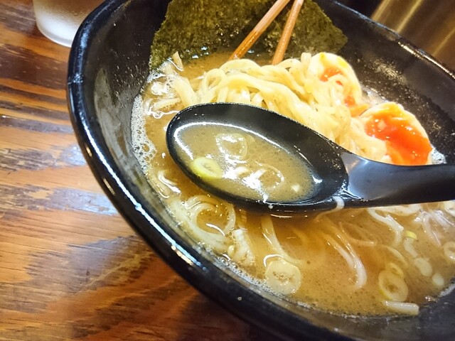 ではスープをいただきます。油分少なめのスープはさらっとした粘度。でも煮干出汁と豚骨出汁のしっかりした濃厚な旨味があって美味しいスープですよ。