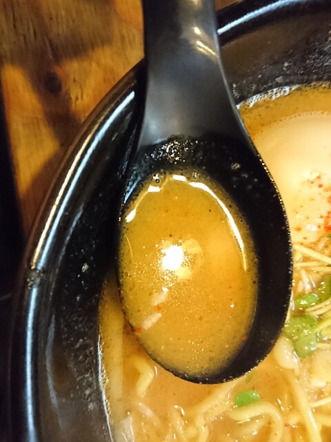 ではスープをいただきます。濃厚な味噌スープに辛味の利いた味わいで味噌スタミナラーメンって言う感じの味わいでピリ辛の美味しいスープですよ。コの味わいは好みの分かれるところでしょうね。お子様とか辛味が苦手なお客には厳しいかもしれませんね。私的にはドはまりの美味しいスープですよ。