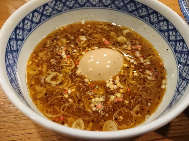 つけ汁には刻みネギ、揚げタマネギ、小粒のあられに味玉が入ってます。