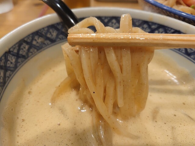 では麺をつけ汁に浸していただきます。程よい粘度のつけ汁は麺によく絡んで口に運ばれます。味噌の香りと旨味がふわっと広がり、ベースの豚骨出汁の旨味が追ってきて美味しいですよ。