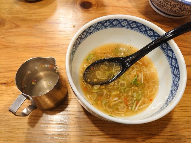 麺を完食して最後はスープ割りで〆ます。魚介系の出汁にあられが浮かべられてて彩もよく店主の遊び心がうかがえますねぇ。