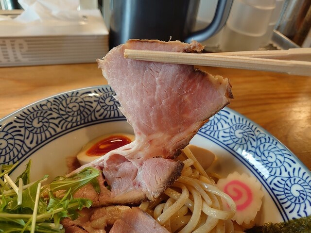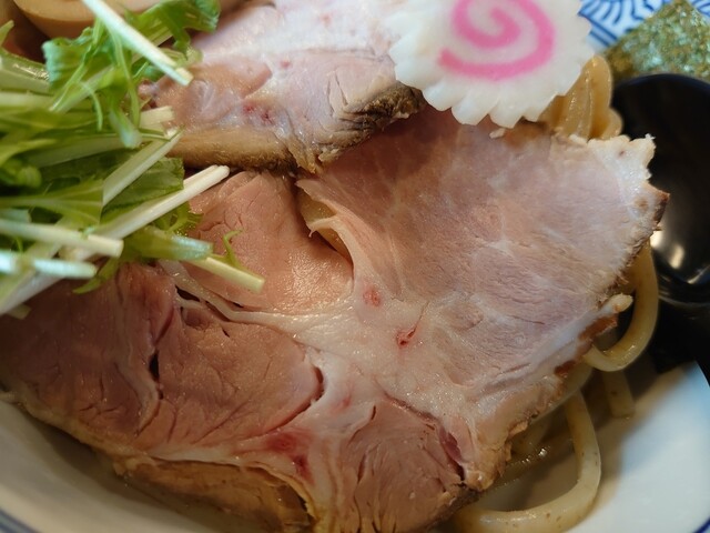 チャーシューはレア仕上げの薄切りのロース肉。味付けもよくしっとりした噛み心地で噛むほどに肉の旨味が味わえます。つけ汁の中のチャーシューは小振りですが厚切りで美味しかったですよ。
