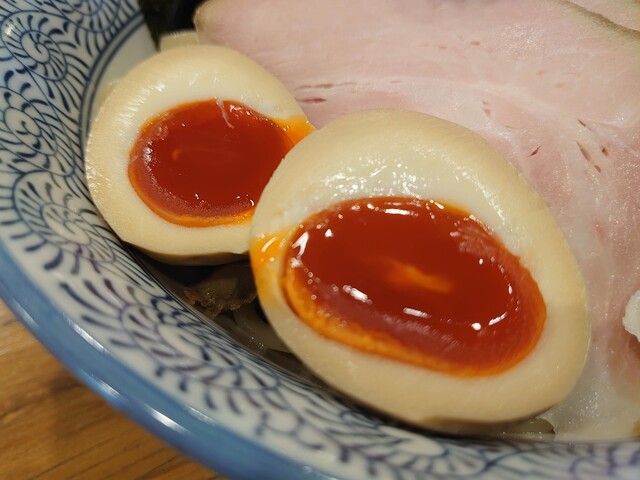 味玉は濃い赤色の黄身の色が印象的です。味付けもよく黄身の甘みが濃厚で美味しいですよ。