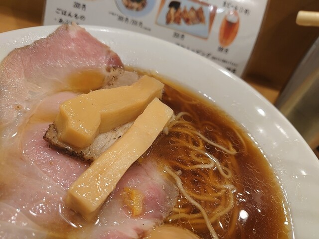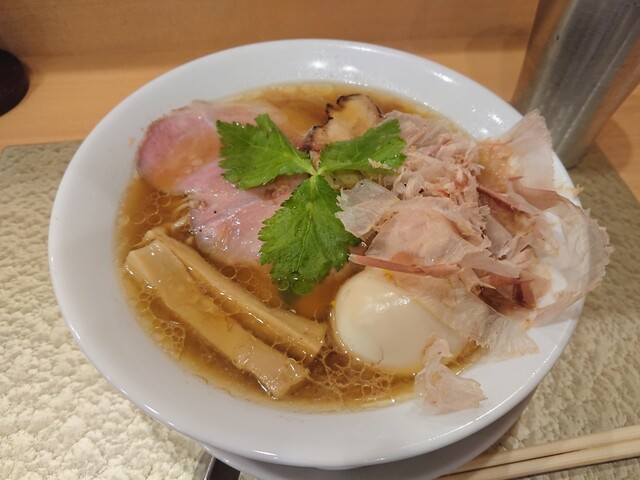 少し待って着丼です。油分そこそこの醤油色の清湯スープにサービストッピングの味玉に大振りなレアチャーシューと少し小振りな炙りチャーシューに材木切りメンマ、ミツバ、追い鰹のトッピングです。