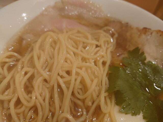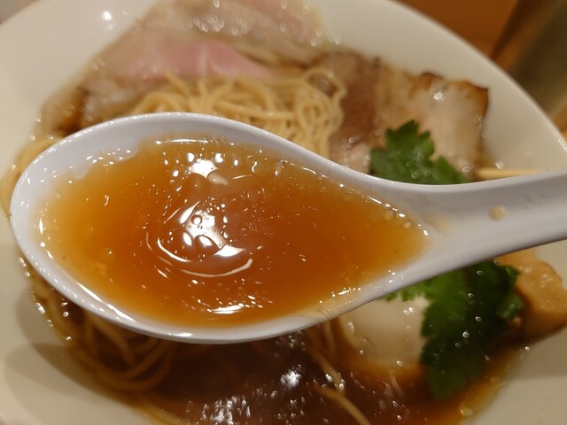 ではスープをいただきます。鶏出汁ベースのスープは魚介の出汁の風味も感じられ醤油のかえしの合わせじゃたも絶妙で出汁の旨味をしっかりと感じられる美味しスープです。