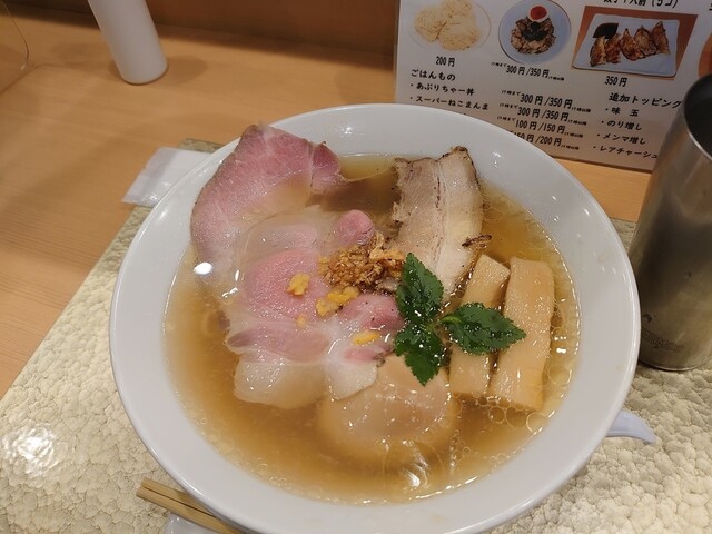 少し待って着丼です。澄んだスープにチャーシューが2種にメンマ、味玉、三つ葉のトッピングです。
