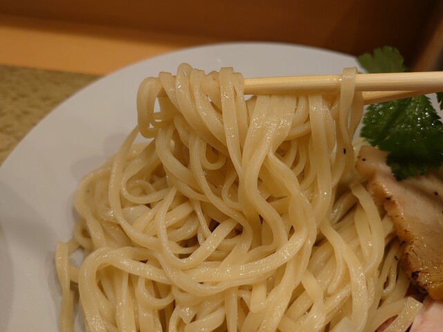 つけ汁はサラっとした粘度で、貝出汁と鶏出汁の旨味がしっかり感じられる濃厚な味わいで塩味は高めですね。