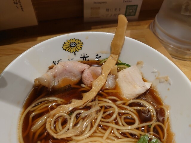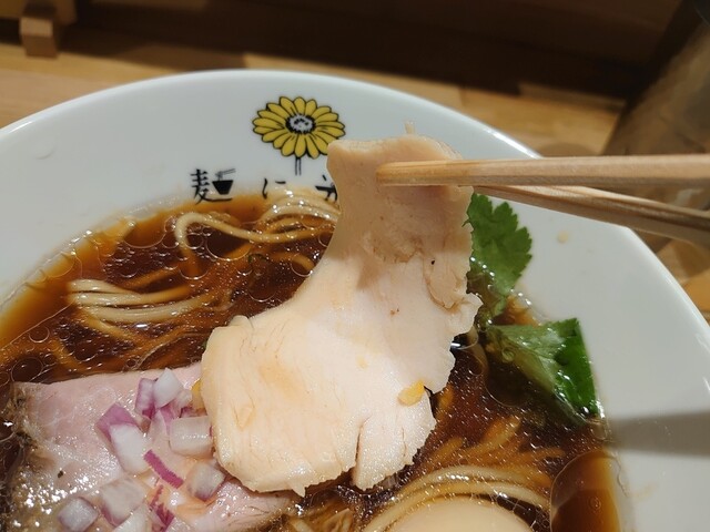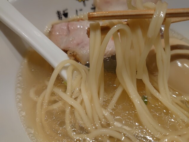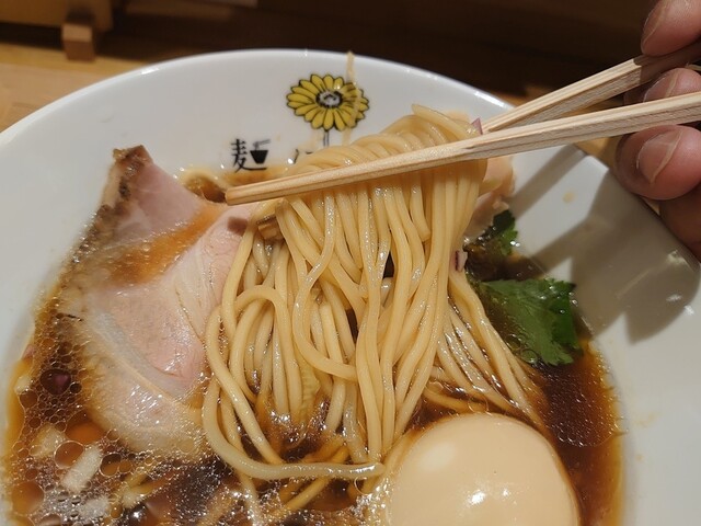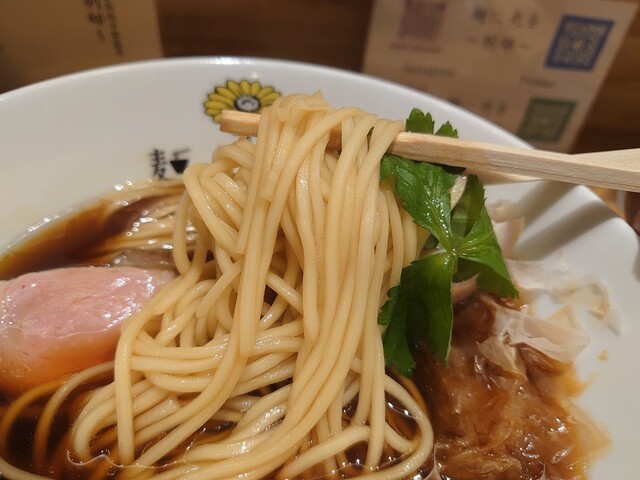 ではスープをいただきます。軍鶏、鴨、丸鶏からとった動物系の出汁に削り節、昆布などの乾物の出汁をブレンドし湯浅の角長醤油ベースのかえしや酒などを合わせたスープは口に含むと口いっぱいに広がる動物系の旨味の味わいと、後から来る魚介の旨味が感じられる深みのある味わいで美味しいスープです。