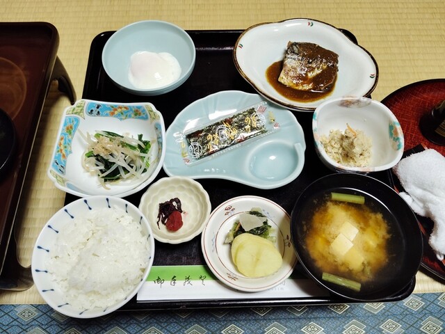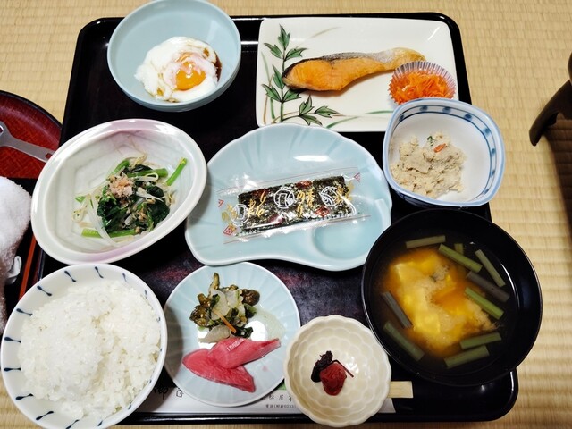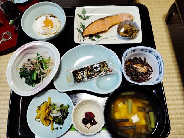 【朝食】7時半くらいに個室に準備。温泉卵、焼鮭、モヤシとほうれん草のお浸し、味海苔、おから煮、漬物、梅干し、味噌汁は豆腐と蕨。ザ・旅館の朝食。