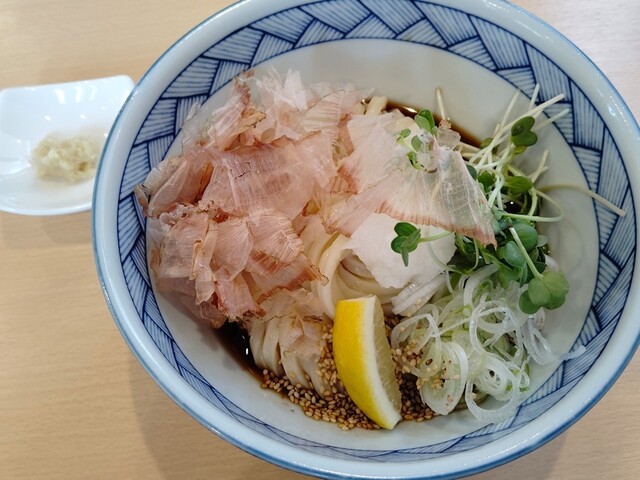 ・ぶっかけ・・綺麗に整えられた麺。コシもあるので1本とか2本とかづつ食べるのが良き。最初はレモン絞らず途中で味変したりちくわにも掛けたり。セルフコーナーの天かすも入れたり♪