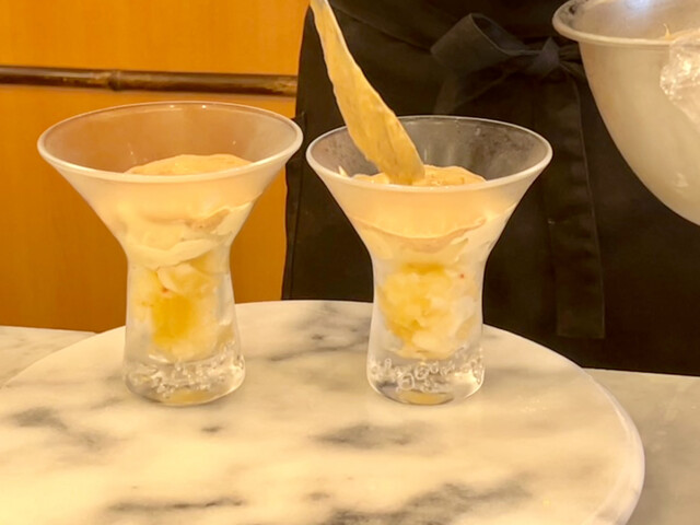 香川県野口さんの桃農家さんから直接仕入れたフレッシュな桃をジュレと生のままシャーベットに❣️その上には栗の手作りアイス渋皮クリーム、生クリームそしてメレンゲ を包むようにモンブランの形に仕上げていく様子は毎回惚れ惚れしてしまいます。