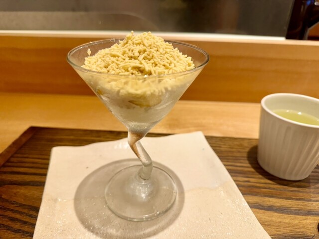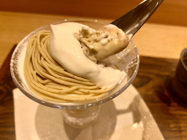 栗そぼろの下には手作り栗アイス栗蜜でソテーした紅玉。最初は個々に食べて食べ進めた後には混ぜ合わせて食べるのがとっても美味しい。