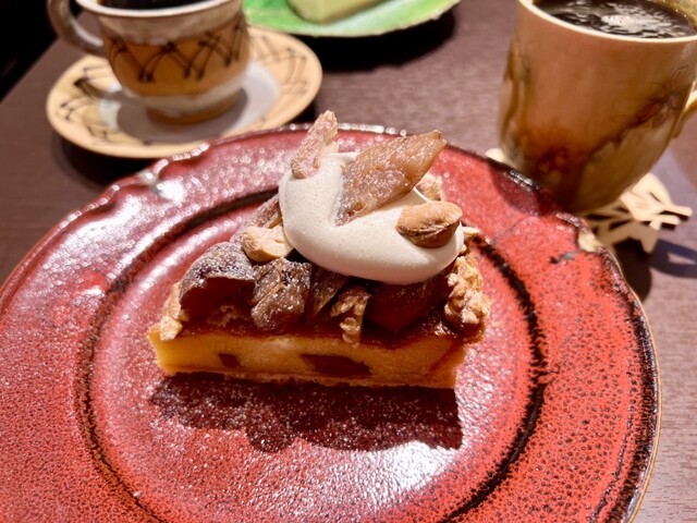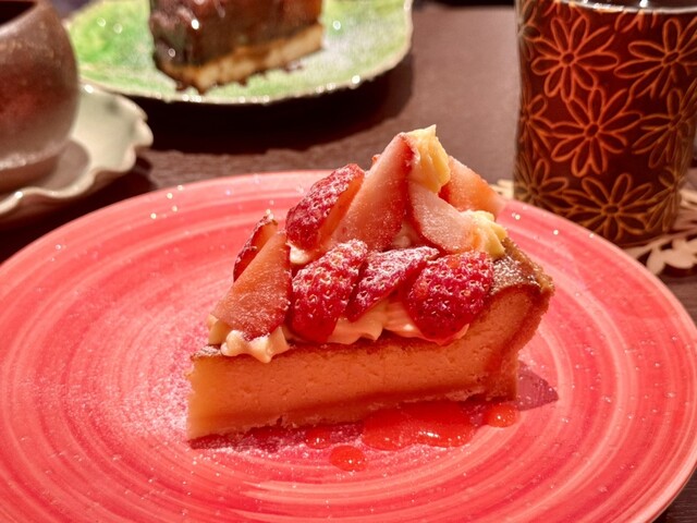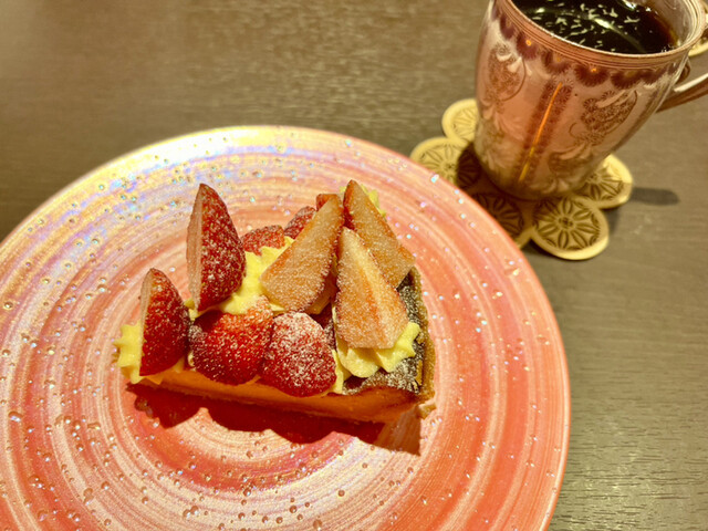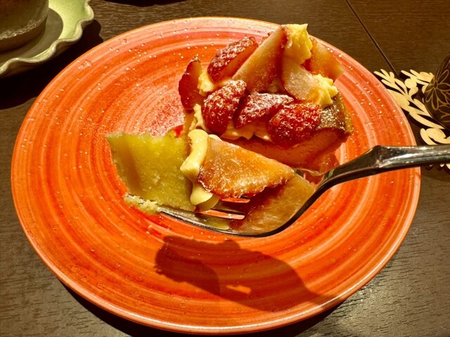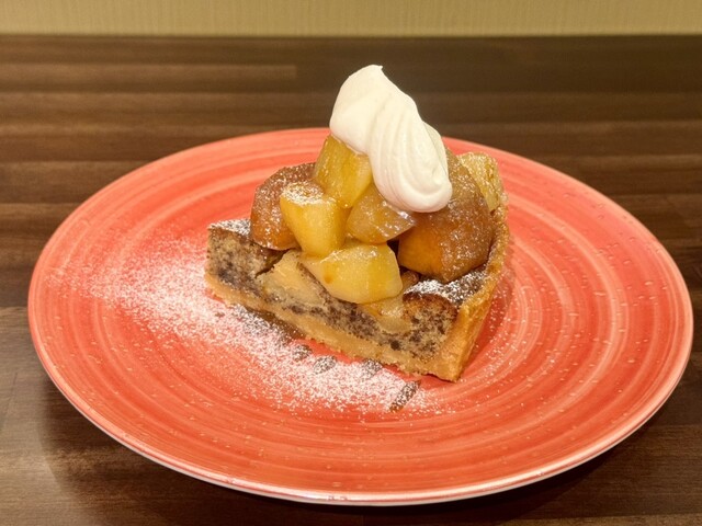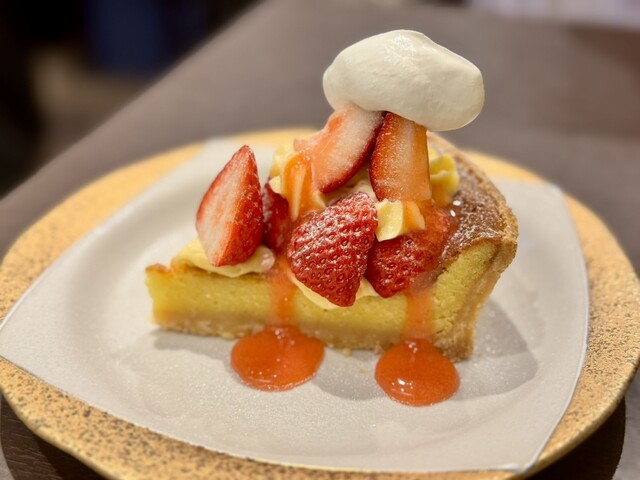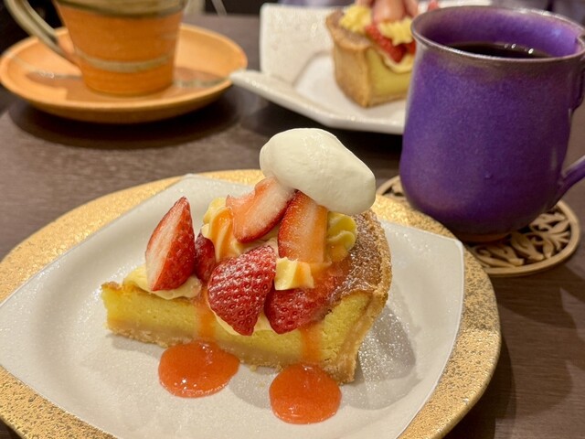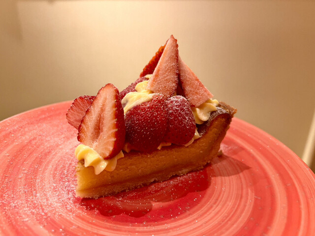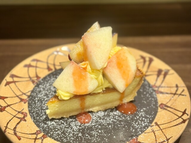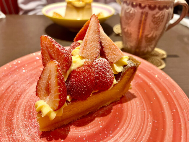 タルトの上の部分はしっとりしていてカスタードクリームの上品な味に甘味のある桃とすももがこぼれるくらい乗っていて嬉しい