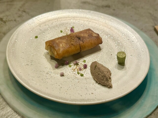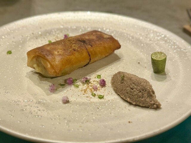 フィンガーライムを絞るのが面白すぎ…そして春巻きの具材が鮎のラグーって美味しすぎた。