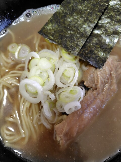 豚バラチャーシュー2、白ネギ、メンマ、のり、背脂