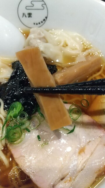 エビワンタン2、肉ワンタン2、豚肩ロースチャーシュー2、材木メンマ2、青ネギ、のり、切り落としチャーシュー3