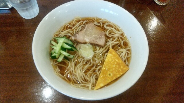 基本冷たいかけそばの様相、チャーシューでラーメン感、冷えすぎてない鰹系の旨味と若干お酢の酸味のきいたスープと香ばしい油の感じは冷たく〆た中華麺の美味しさを引き出す仕上がりかと、ただ麺の印象が違うな、変わったのかな???