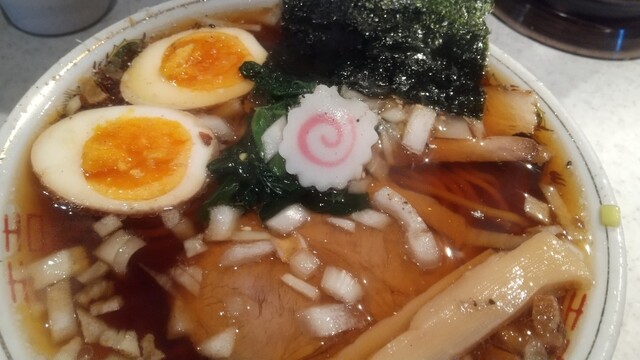 豚バラチャーシュー、豚肩チャーシュー、玉ねぎみじん切り、メンマ、ほうれん草、ナルト、のり、黒ゴマ?、あご粉?、煮玉子