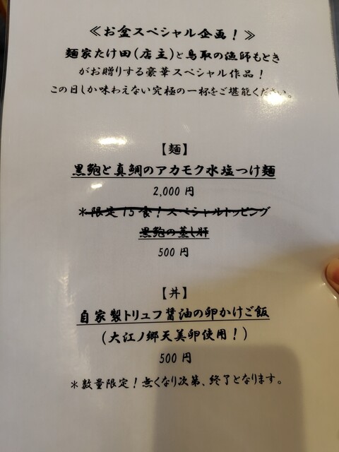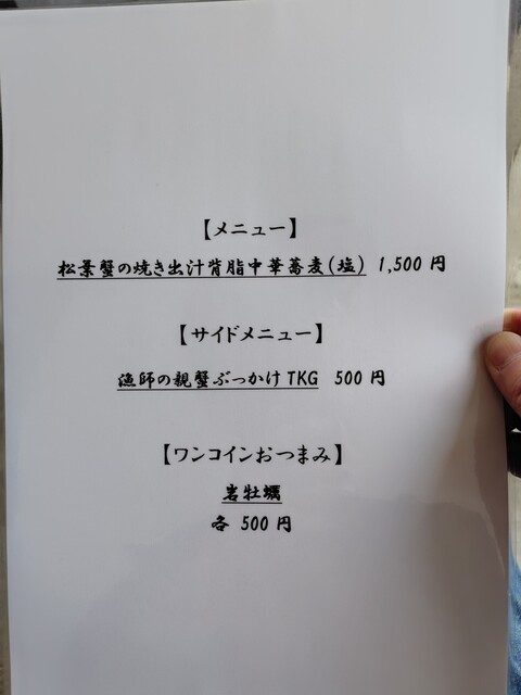 松葉蟹の焼き出汁背脂中華蕎麦(塩)1500円、漁師の親蟹ぶっかけTKG500円(この日限定)