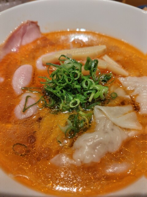 豚肩レアチャーシュー、ほうれん草、アーリーレッドみじん切り、海苔、味玉、背脂