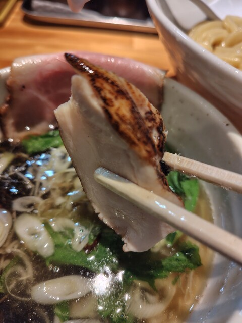 薄めの豚レアチャー、皮目炙った鶏モモチャーはレア気味だが悪くない