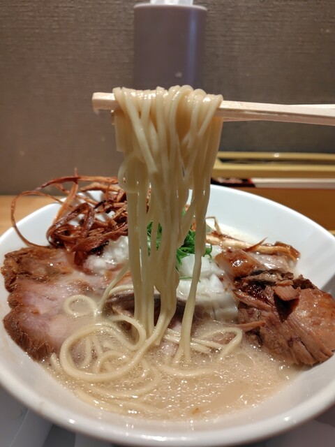 麺は細いストレート麺、パツッとした低加水な味わいはやはりたけ田さんの塩と同じ麺かな?