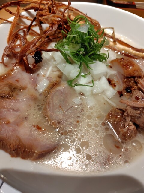 豚肩チャーシュー3、玉ねぎみじん切り、青ねぎ、ナルト、背脂、ブラぺ