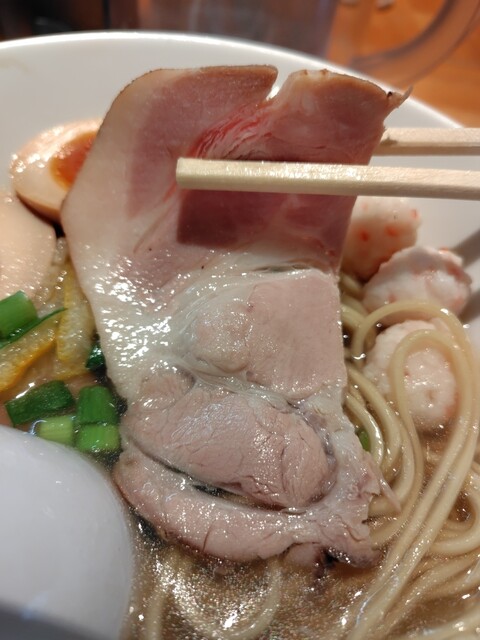 豚肩レアチャーシュー3、蟹つみれ3、味玉、青ネギ、柚子皮